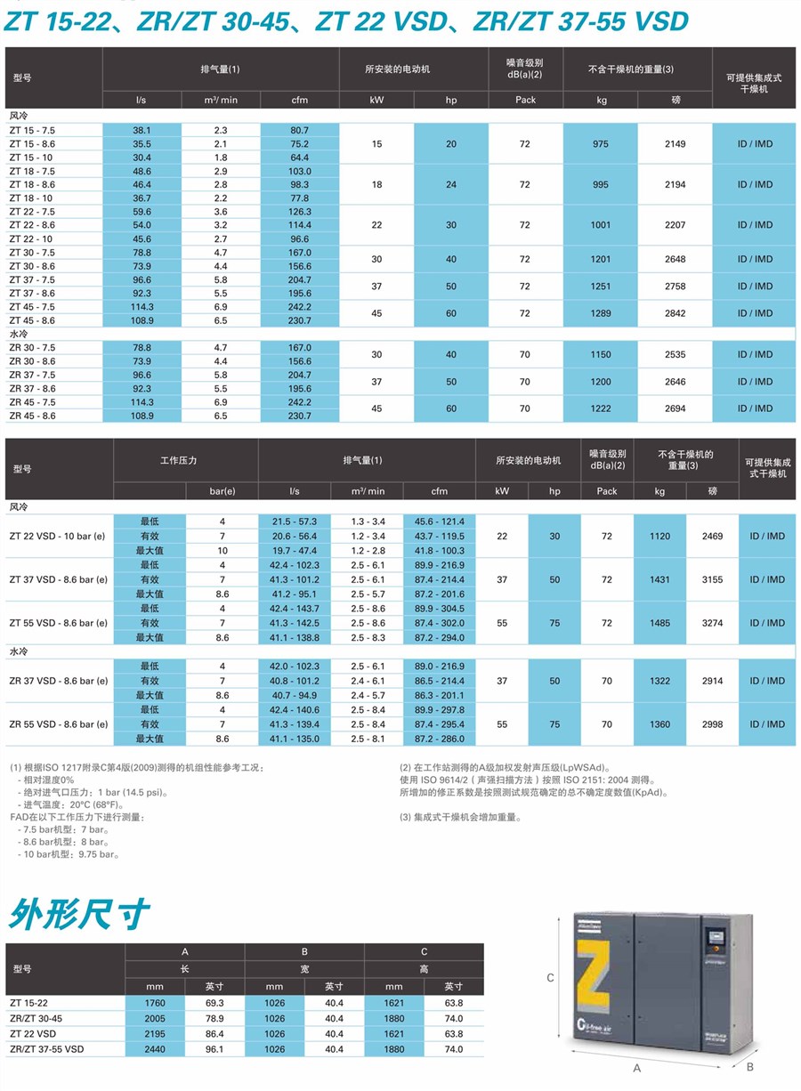 ZR 和 ZT 螺桿式和旋齒式無油空氣壓縮機作為“全功能”套件提供,其中包含
