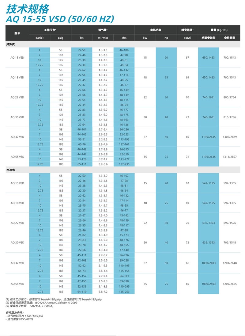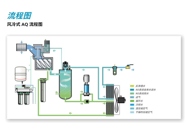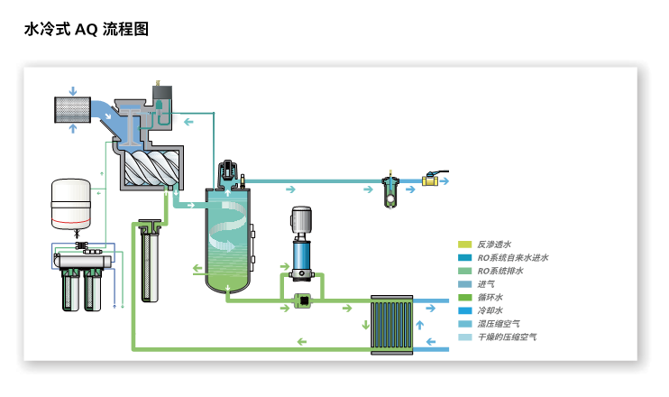 AQ擁有創新的無油技術,噴水螺桿通過ISO8573-1零等級認證設置空氣純度標準,AQ提供風冷與水冷,現場型和全性能型,由于水的冷卻效果確保熱量有效的去除從而提高了能源效率。